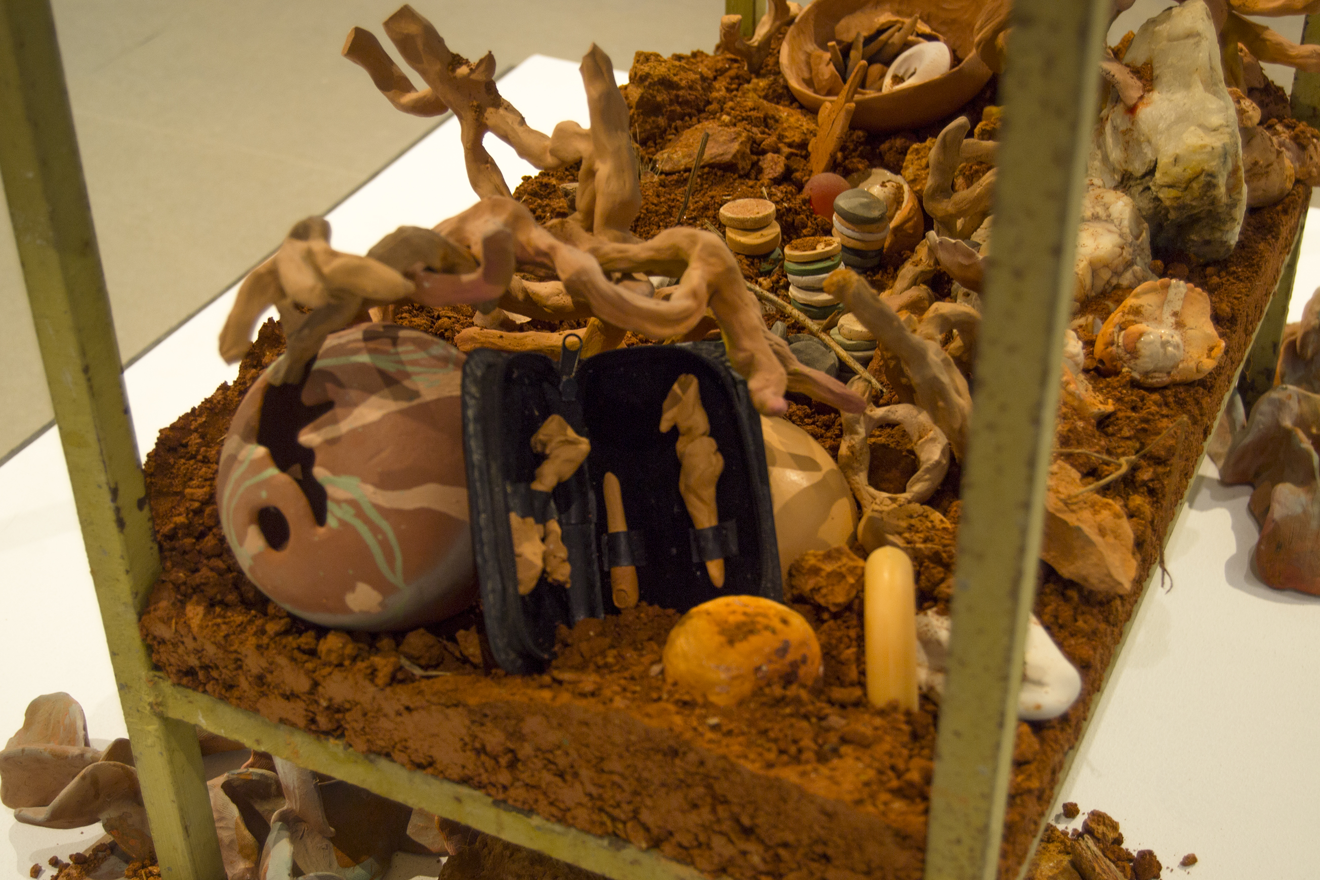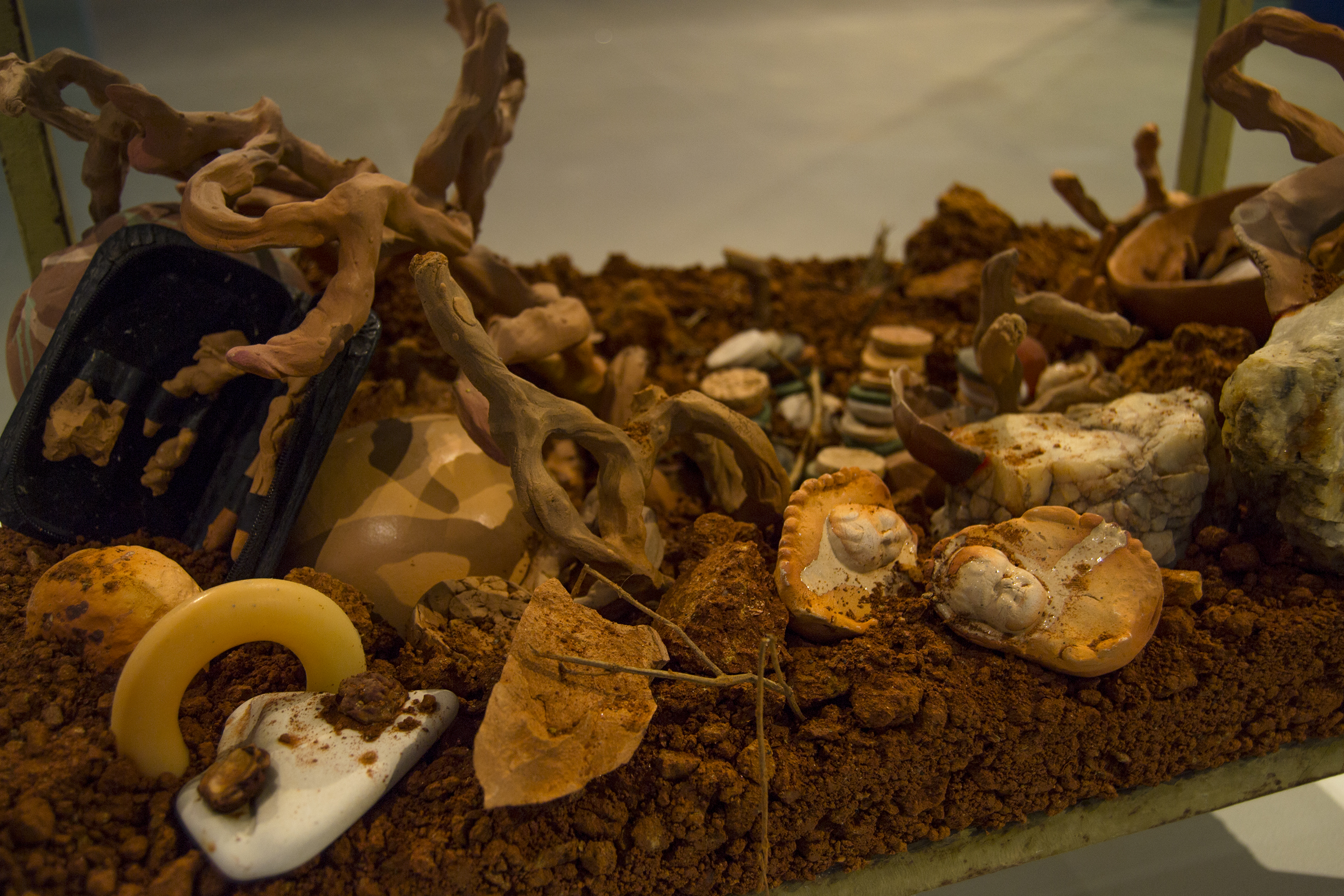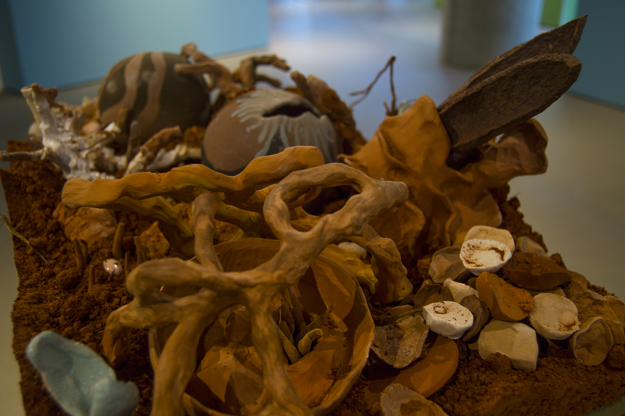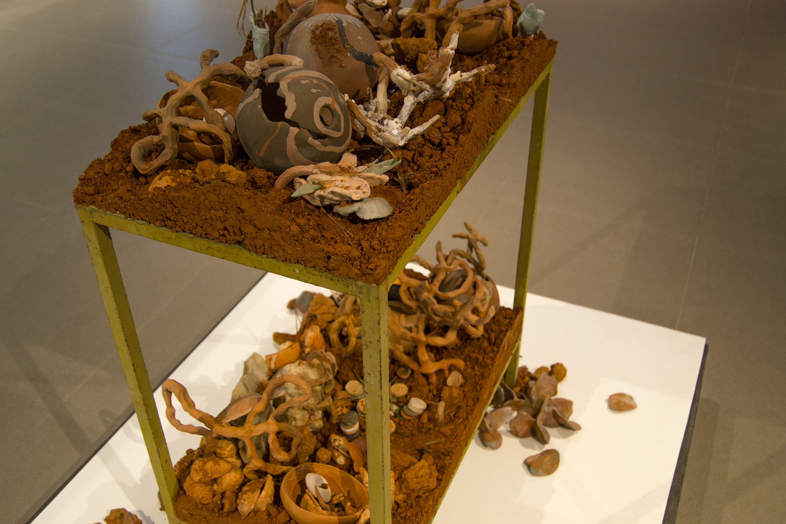Las esculturas se disponen sobre una estructura de dos niveles, sostenidas sobre pisos de terracota. La terracota, material orgánico y mutable, opera como hilo conductor: su tonalidad terrosa remite fisiológicamente al suelo de Karimao, mientras la rigidez obtenida después del fuego nos habla sobre lo perdurable: aquello que, aunque se fractura perdura. El conjunto trasciende su origen fragmentario para convertirse en un paisaje sintético. Cada pieza, en su intimidad formal, dialoga con las demás: raíces retorcidas se contraponen a esferas, creando tensiones entre lo natural y lo abstracto. La disposición caótica pero deliberada invita a recorrer la mesa como un territorio a descifrar, donde la vegetación se codifica en gestos escultóricos.
