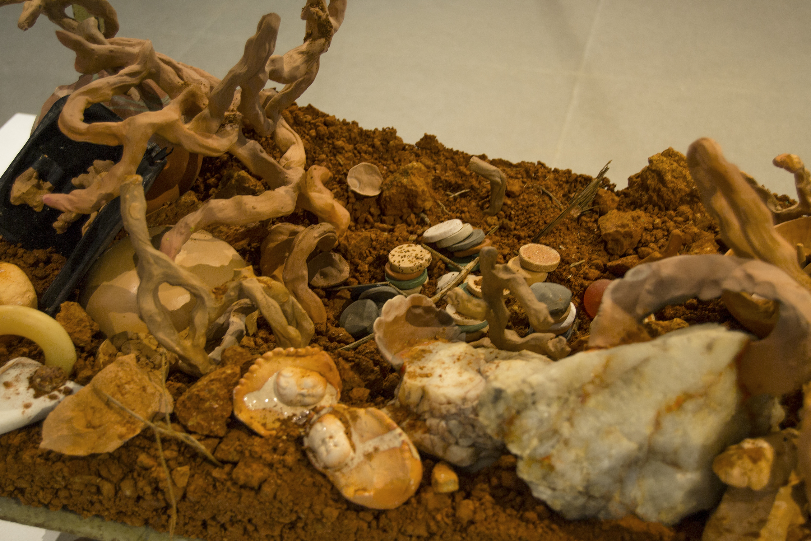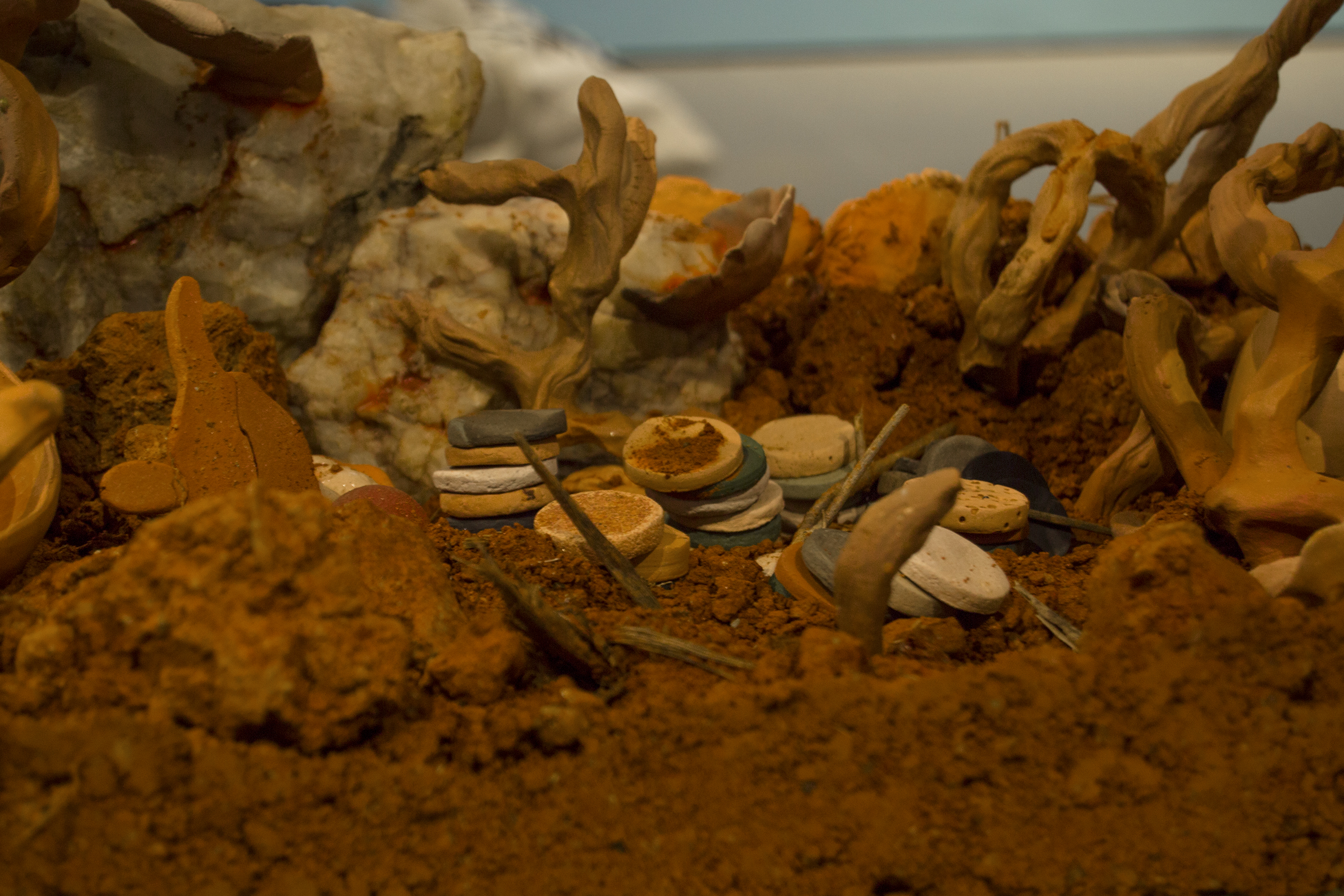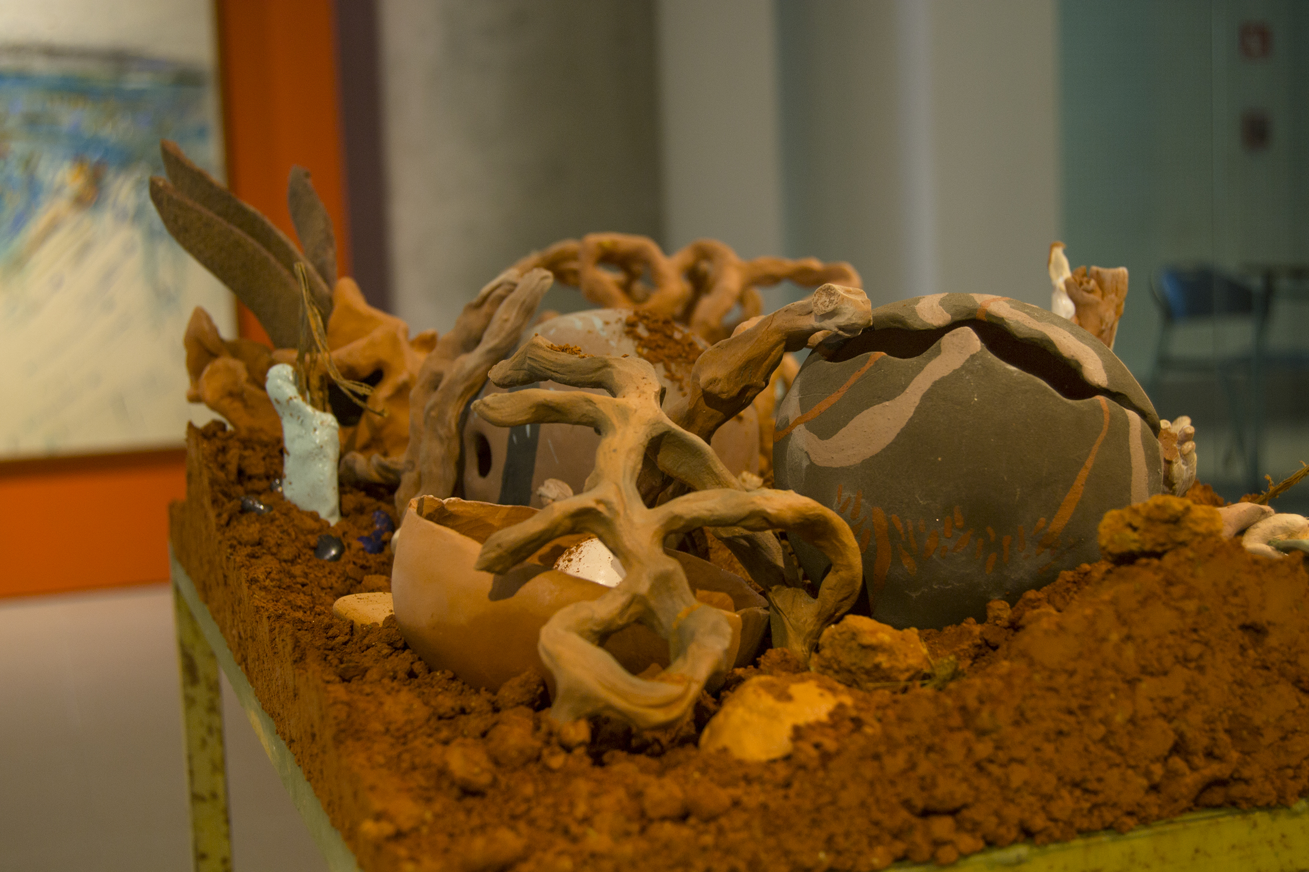 Las esculturas se disponen sobre una estructura de dos niveles, sostenidas sobre pisos de terracota. La terracota, material orgánico y mutable, opera como hilo conductor: su tonalidad terrosa remite fisiológicamente al suelo de Karimao, mientras la rigidez obtenida después del fuego nos habla sobre lo perdurable: aquello que, aunque se fractura perdura. El conjunto trasciende su origen fragmentario para convertirse en un paisaje sintético. Cada pieza, en su intimidad formal, dialoga con las demás: raíces retorcidas se contraponen a esferas, creando tensiones entre lo natural y lo abstracto. La disposición caótica pero deliberada invita a recorrer la mesa como un territorio a descifrar, donde la vegetación se codifica en gestos escultóricos.