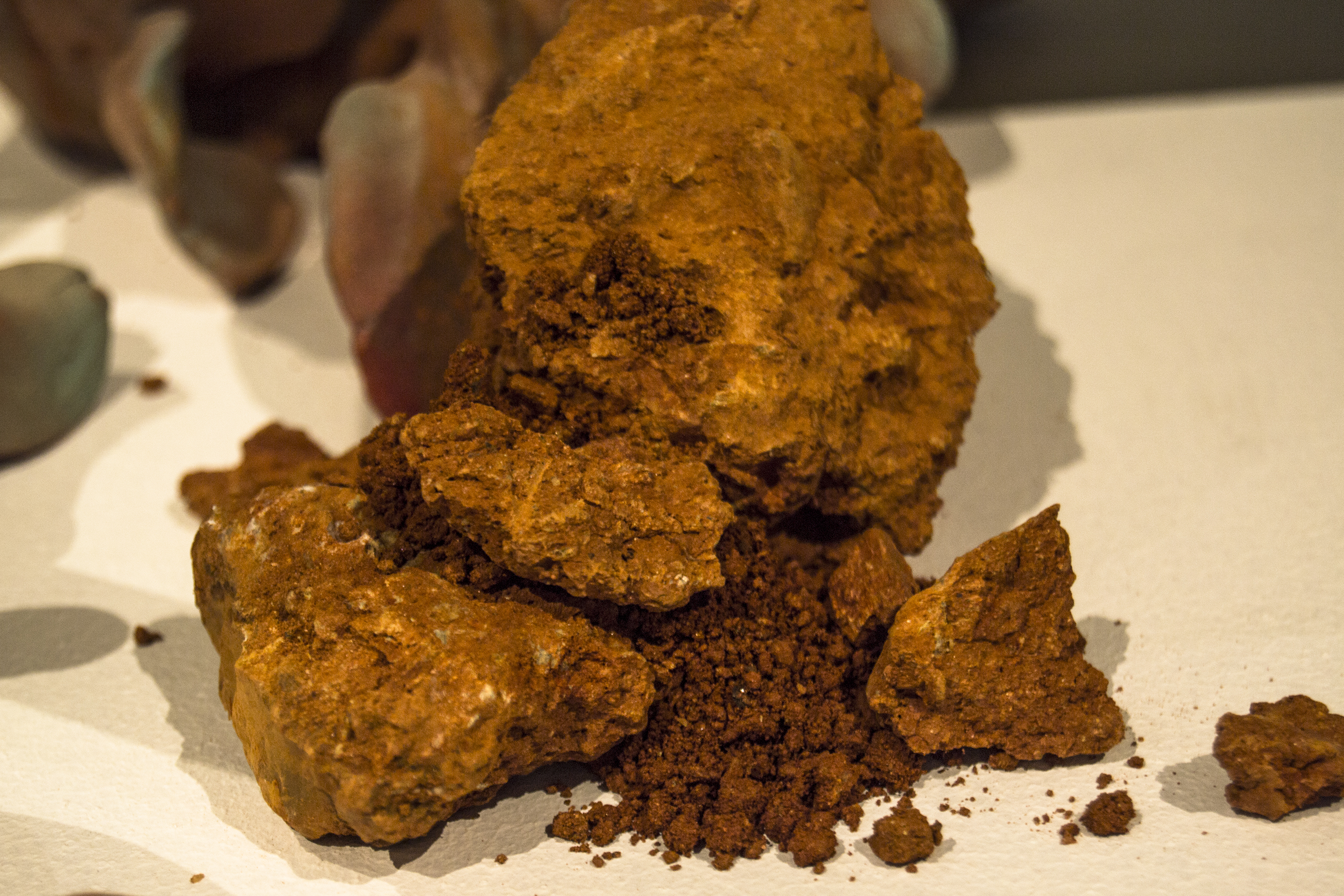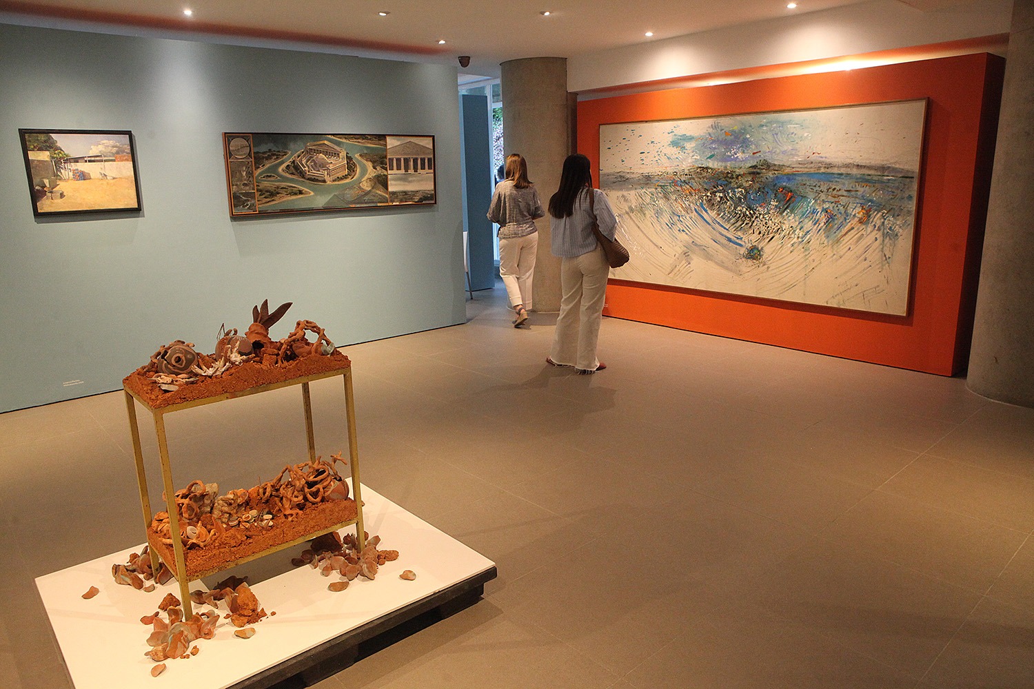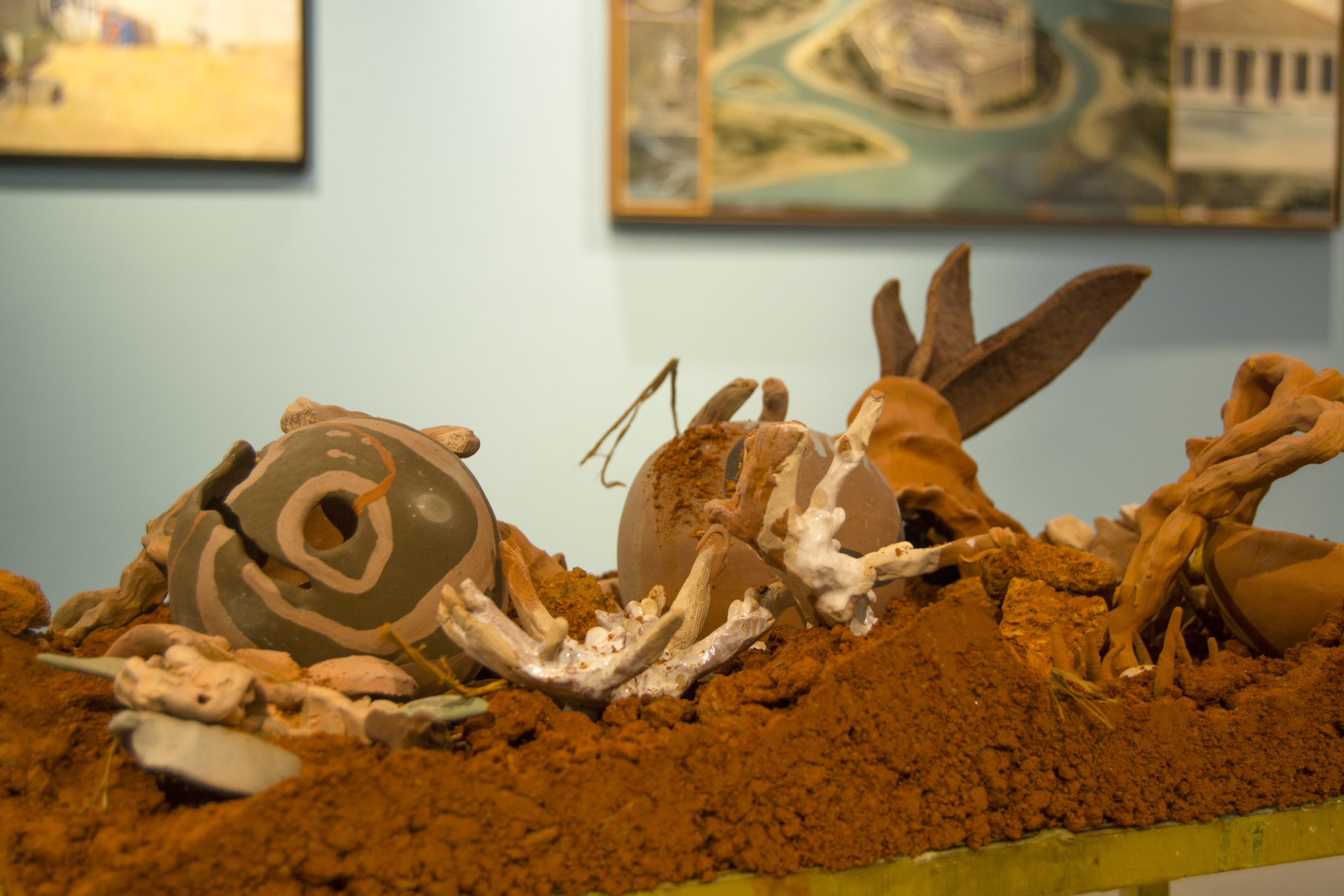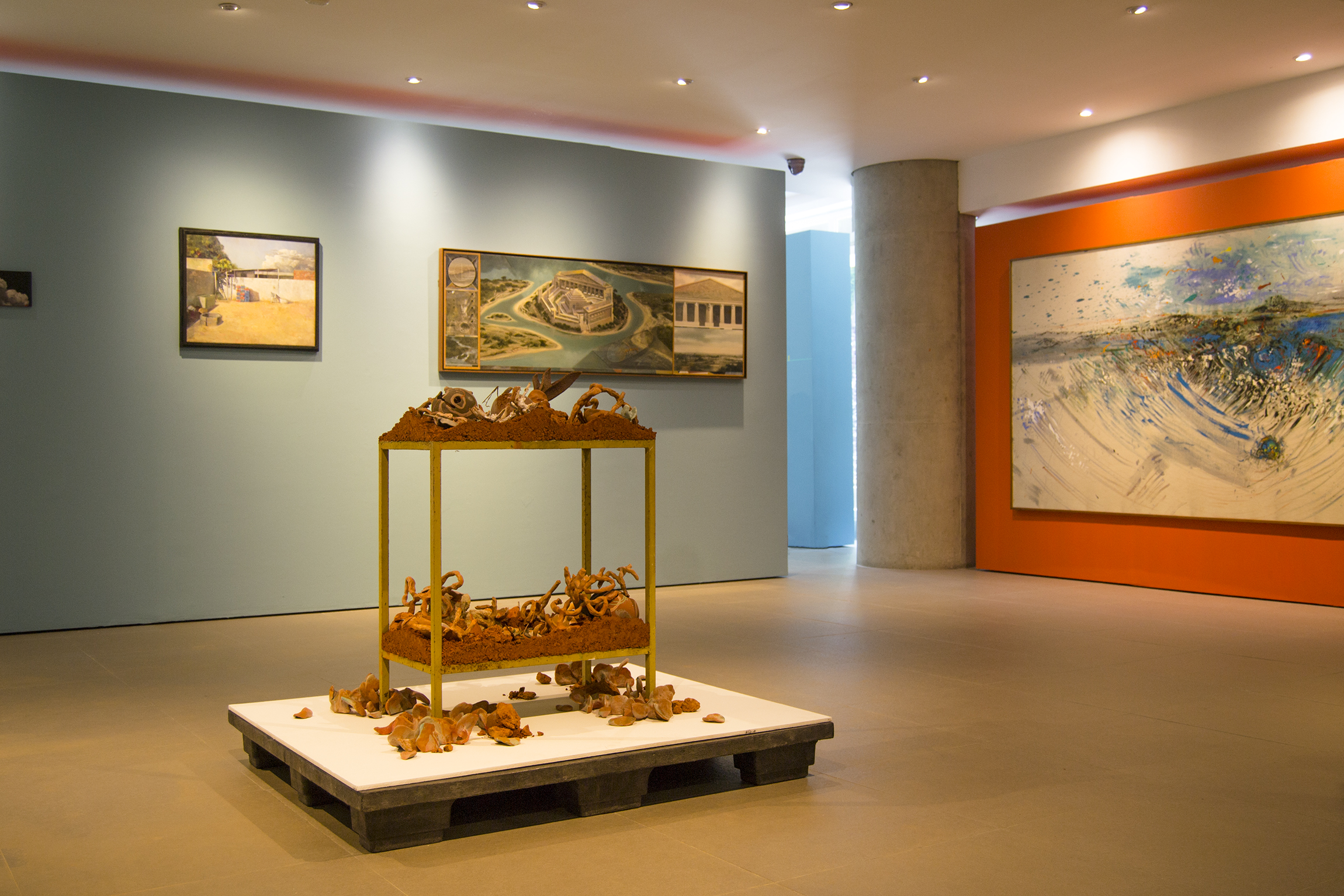 Las esculturas se disponen sobre una estructura de dos niveles, sostenidas sobre pisos de terracota. La terracota, material orgánico y mutable, opera como hilo conductor: su tonalidad terrosa remite fisiológicamente al suelo de Karimao, mientras la rigidez obtenida después del fuego nos habla sobre lo perdurable: aquello que, aunque se fractura perdura. El conjunto trasciende su origen fragmentario para convertirse en un paisaje sintético. Cada pieza, en su intimidad formal, dialoga con las demás: raíces retorcidas se contraponen a esferas, creando tensiones entre lo natural y lo abstracto. La disposición caótica pero deliberada invita a recorrer la mesa como un territorio a descifrar, donde la vegetación se codifica en gestos escultóricos.