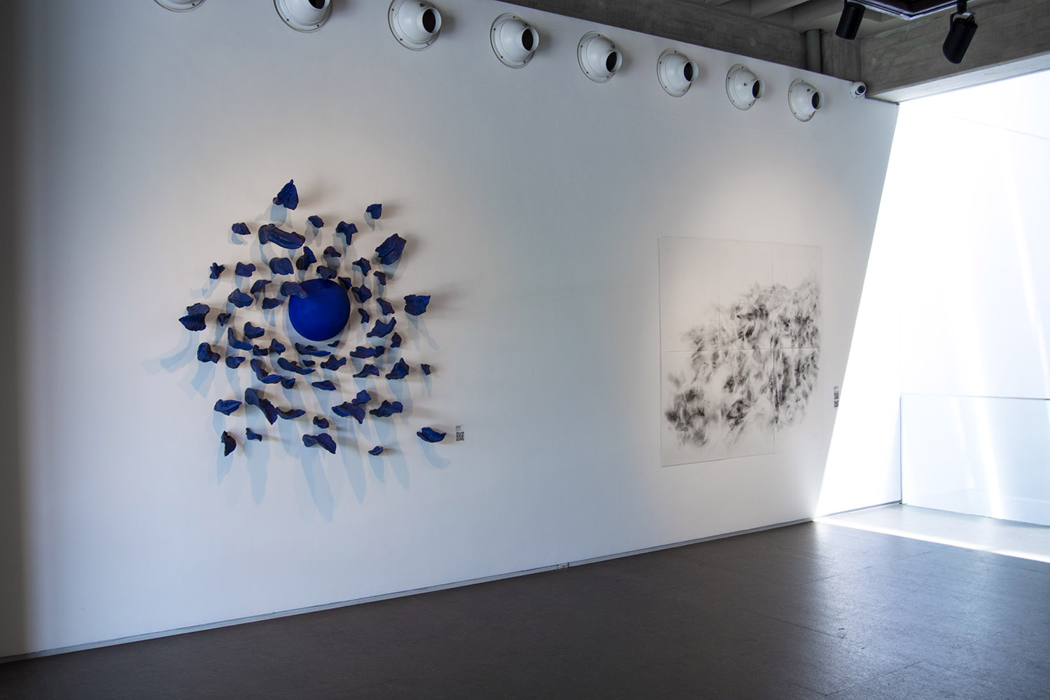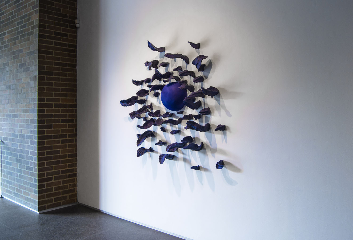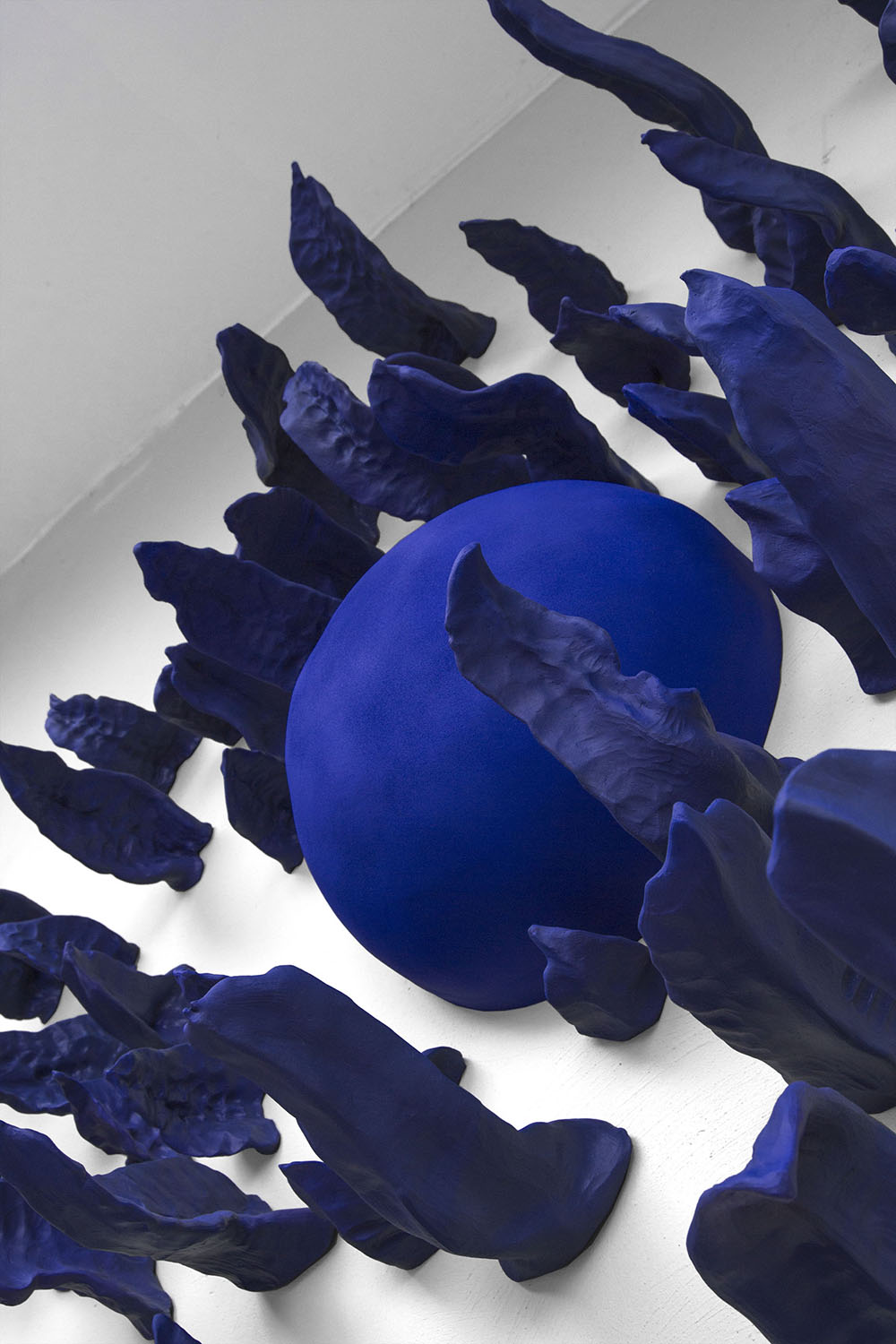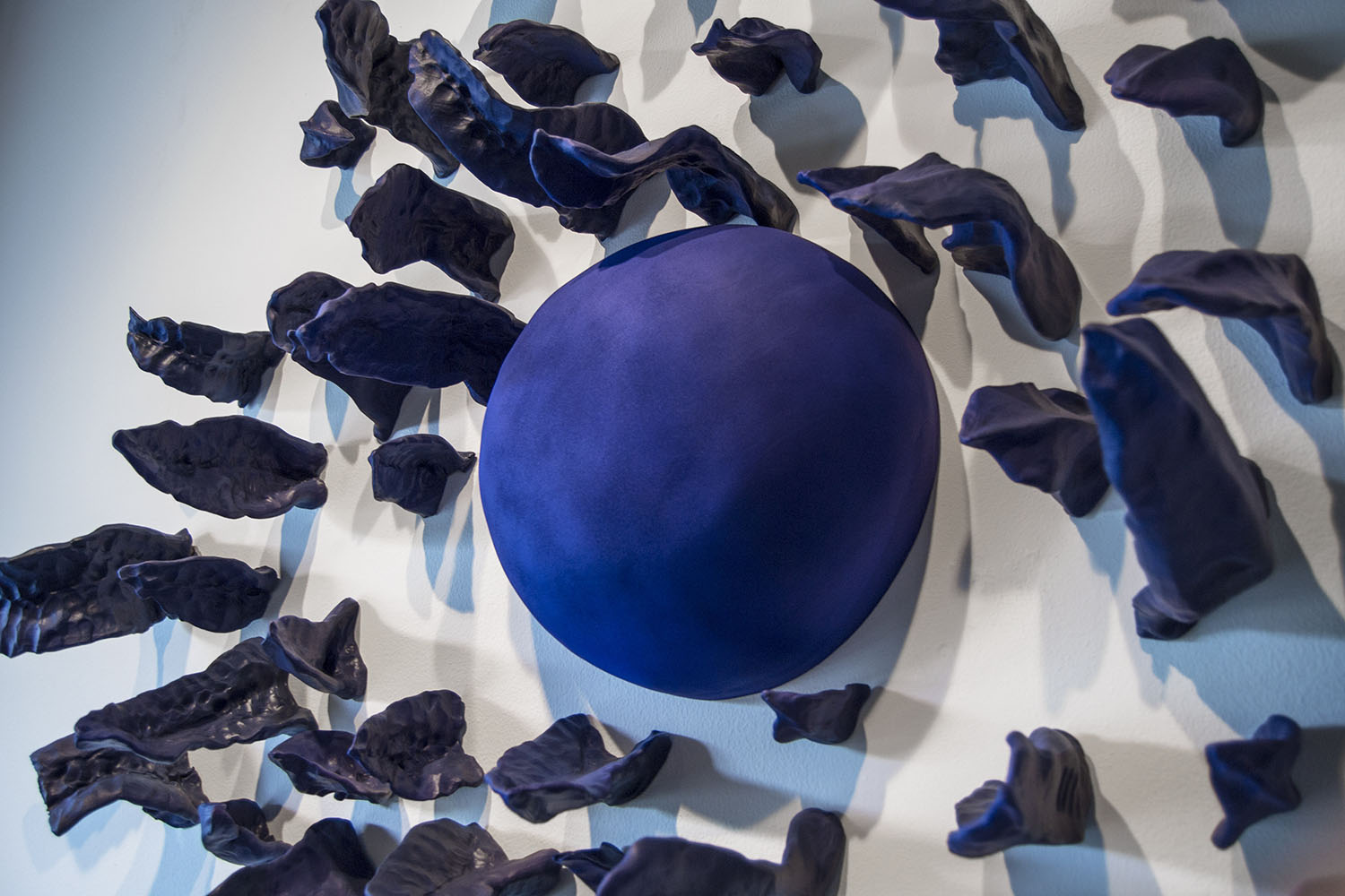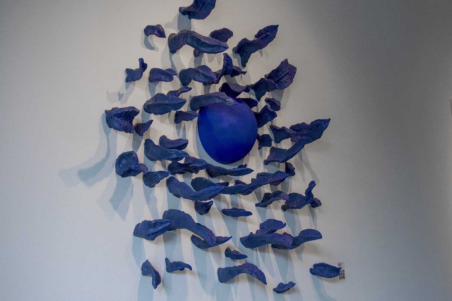 La Luna escondida es una flor azul es un proyecto escultórico de instalación vertical compuesto por 62 piezas, permite observar una serie de elementos orgánicos que registran en sus cuerpos la huella humana resultado de la acción de modelar el barro para construir el paisaje, una media esfera representa al satélite como punto central de la composición, obteniendo una propuesta de 170 cm de alto x 150 cm de ancho x 31 cm de profundidad.